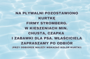 Na pływalni pozostawiono kurtkę firmy STROMBERG. W kieszeniach min. chusta, czapka i zabawki dla psa. Właściciela zapraszamy po odbiór (przy odbiorze należy wskazać kolor kurtki)...