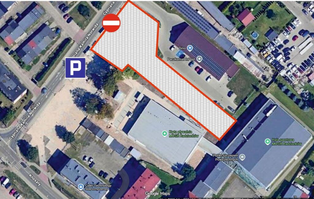 W dniu 28 listopada oznaczona na zdjęciu część parkingu zostanie wyłączona z użytkowania w związku z organizacją imprezy Barbórkowej w hali sportowej.